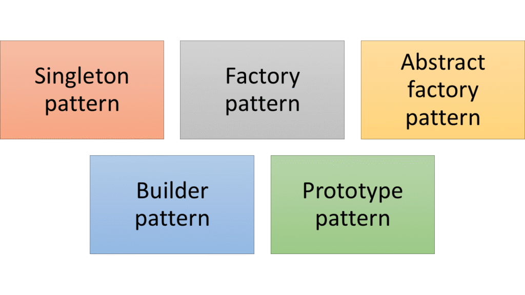 These design patterns address the problem of object creation. They make the task of object creation, composition, and representation different from the system. This category includes 5 patterns. Creational patterns hide object construction, provide encapsulation, and promote loose coupling. Without these patterns, code becomes tightly coupled to the concrete class. Also, the object creation logic becomes duplicated.