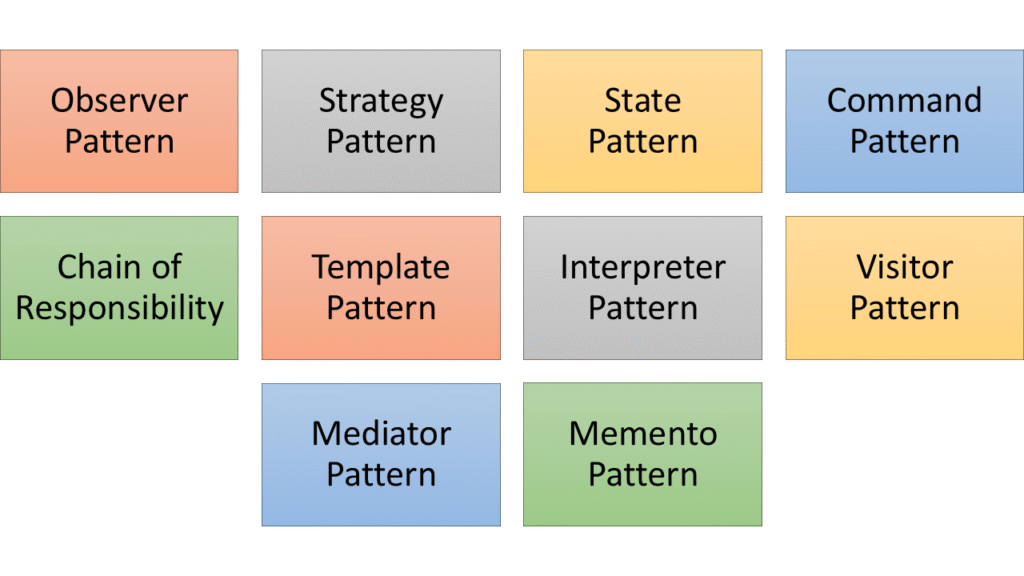 These concern algorithms and the assignment of responsibilities between objects. They define a pattern of communication between the objects. They help objects to communicate, delegate tasks, and vary behavior without changing their classes. These patterns promote loose coupling, improve flexibility, and reuse. These allow changing behaviour at runtime. They are 10 in number.